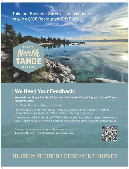 Travel North Tahoe Nevada (TNTNV), in partnership with Longwoods International, is participating in a nationwide resident sentiment research project in the Incline Village and Crystal Bay area and residents are encouraged to participate. A 15-minute online survey is being designed to measure residents’ perceptions and behaviors on several tourism-related topics such as economic development, tourism benefits and disadvantages, environmental impacts, tourism employment and program implementation awareness. Your feedback is invaluable and will help TNTNV shape the future of tourism efforts in Washoe Tahoe.
