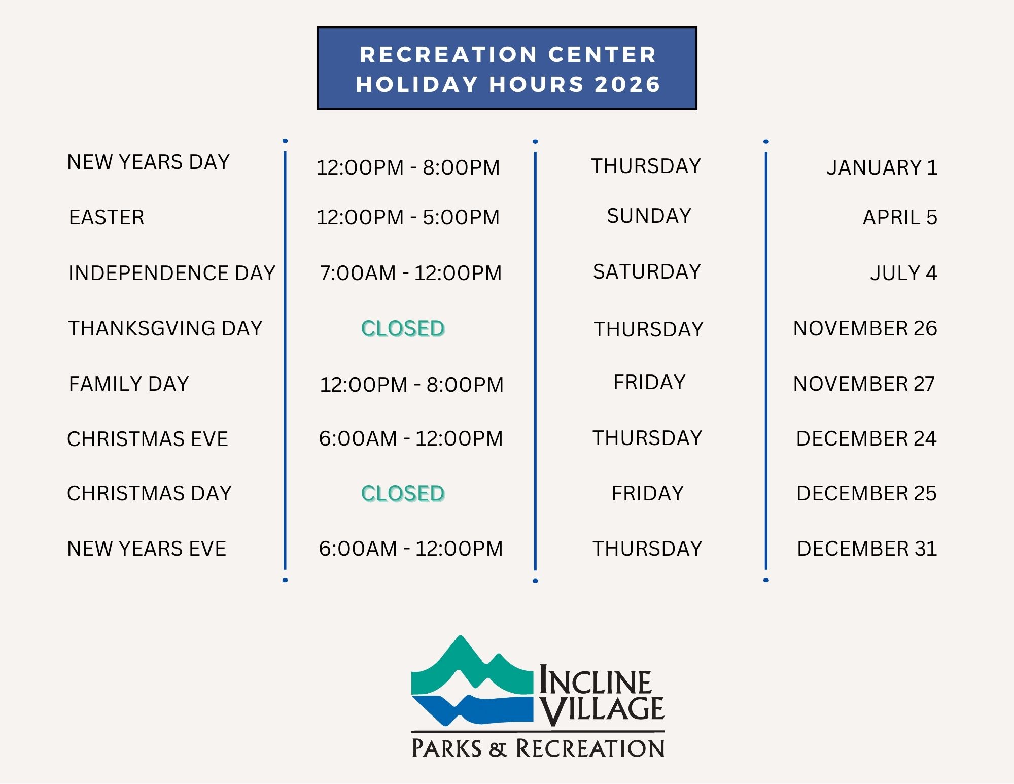 The Recreation Center front desk staff is available for business transactions (e.g. IVGID passes and punch cards, renter/tenant privileges, etc.) during these hours: